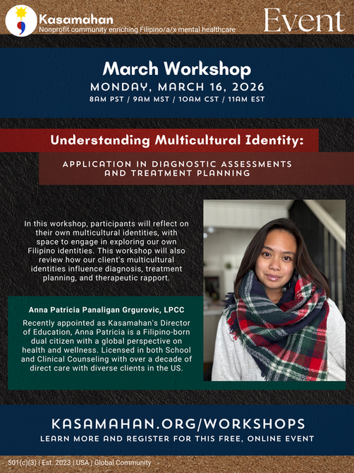 The purpose of Kasamahan is to provide enrichment and growth to Filipino/a/x mental health professionals by understanding the roots, identity, and culture of the Filipino community as it relates to mental health.